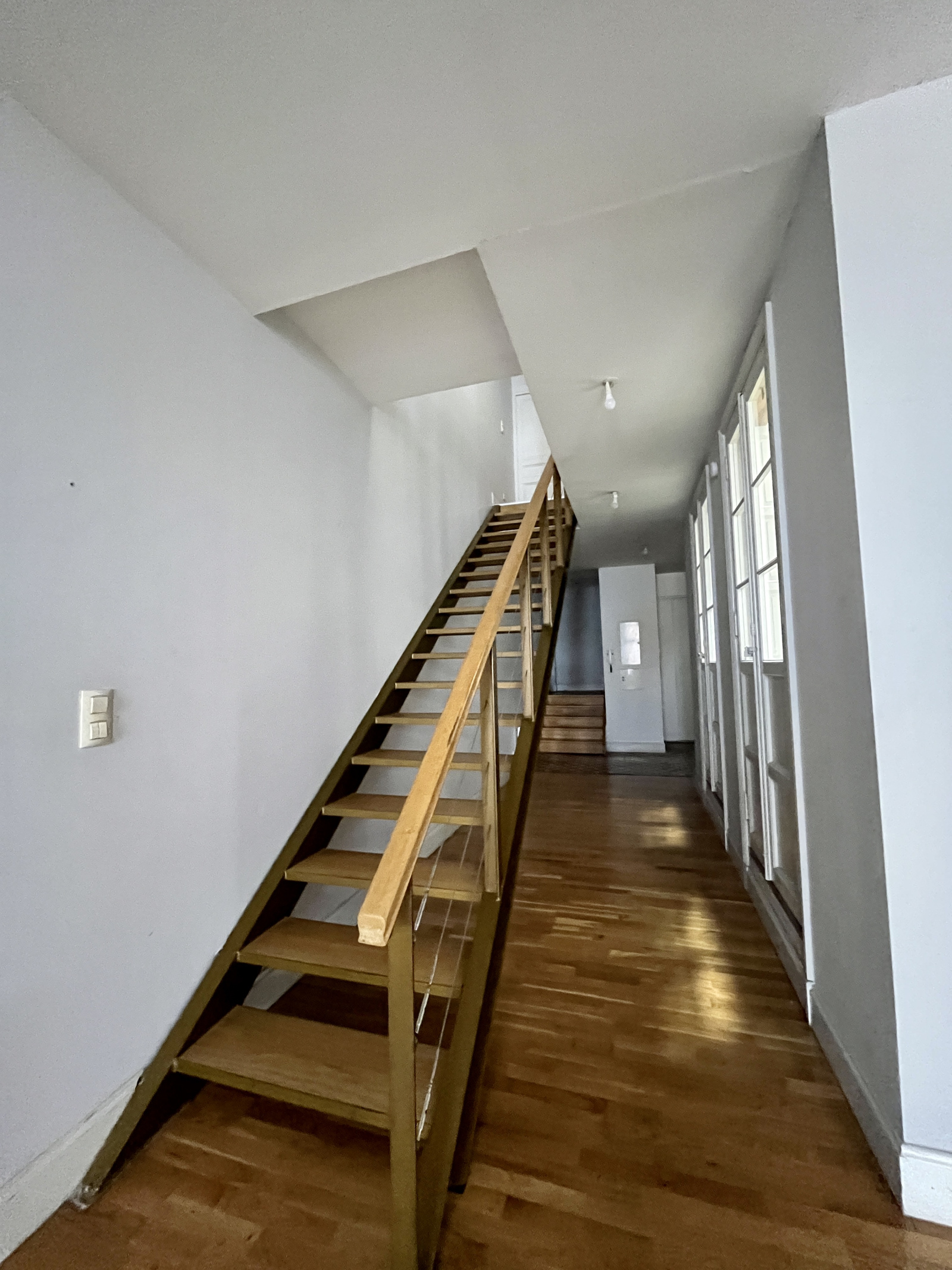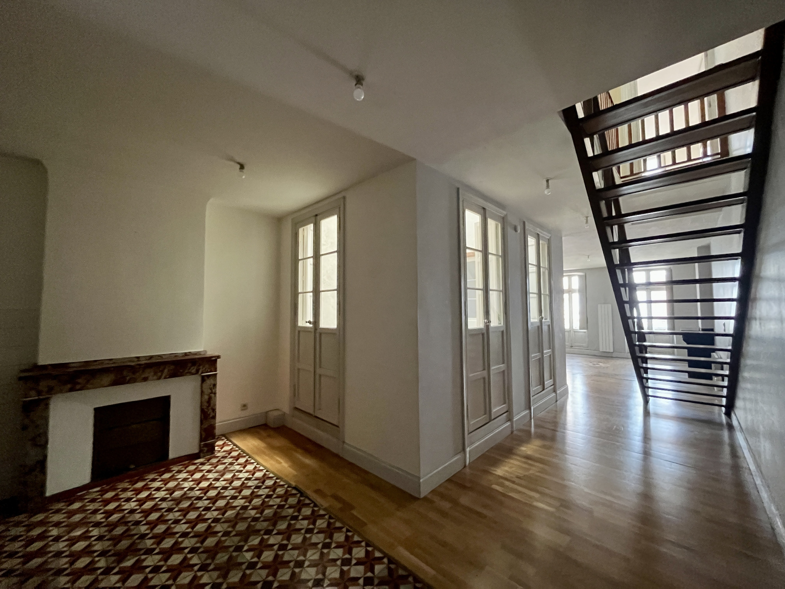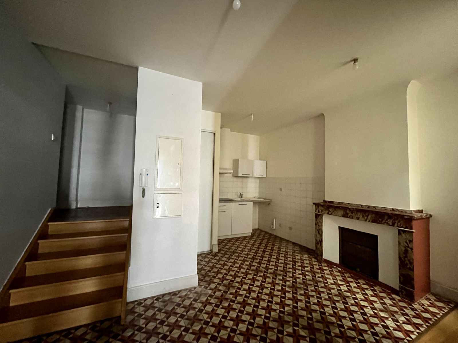 Le 1er étage de cet appartement comprend une entrée, une grande pièce de vie avec cheminée et cuisine ouverte.